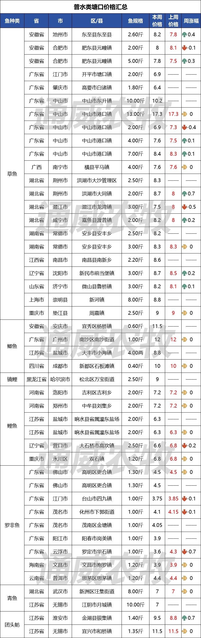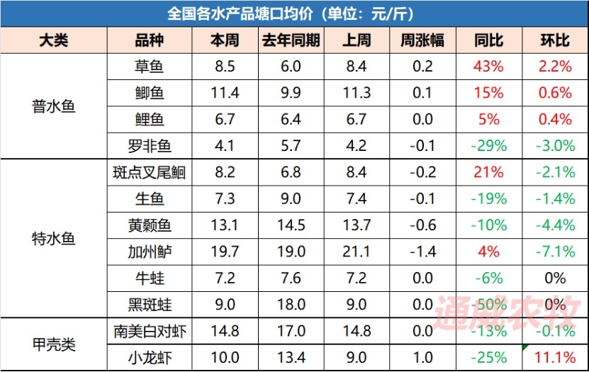 本周主要上涨的品种是草鱼、鲫鱼、鲤鱼、小龙虾;主要下跌的水产品是罗非鱼、斑点叉尾鮰、生鱼、黄颡鱼、加州鲈鱼;牛蛙、黑斑蛙、南美白对虾价格与上周基本持平。