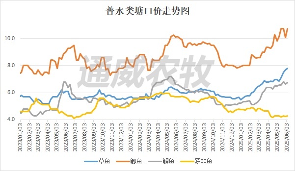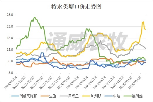 本周普水鱼价格呈现稳中有涨态势,特水鱼价格呈现稳中有跌态势。普水鱼中,华南草鱼随市场供应陆续增加,局部地区价格有回落态势,华中、华西、华北等地价格表现依旧强劲,价格环比上涨2.2%。罗非鱼受存塘鱼陆续达上市规格,但加工厂收鱼减少,市场供需失衡,价格环比下跌3%。值得注意的是:近期广东佛山地区加州鲈陆续上市,叠加彩虹病毒致死亡率较大,养户被迫出鱼,市场供应充足,价格明显下跌。后市随新鱼陆续上市,加州鲈价格或迎来小幅下跌空间。